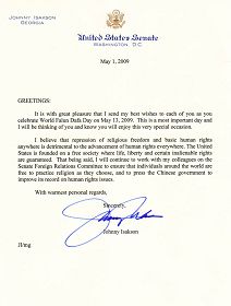美国联邦参议员艾瑟克森二零零九年五月一日发来贺信,祝贺世界法轮大法日。
