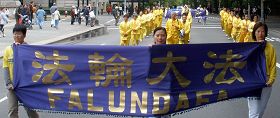 ![]() “法轮大法”横幅引领的法轮功学员游行队伍 |