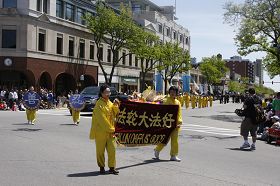 二零零九年五月十六日,法轮功学员参加了在美国康奈狄克州温泽市的筛德德比游行。