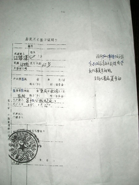 江锡清老人被迫害致死后,江的家属一直找有关部门,要求劳教所对此负责并严惩凶手。西山坪劳教所的恶警们妄图逃脱他们的罪恶,串通地方的邪警、国安大队和公安派出所对江家属进行骚扰和威胁。先是对江的大女儿江宏进行骚扰,因家中没人,各级派去的二十余人扑了个空。后来就对江的儿子江洪斌进行威胁,并找到他所在的单位地税局局长一同去施压,要他们放弃追查凶手。