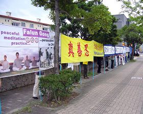 学员们打出“法轮大法好”、“真、善、忍”、“停止迫害法轮功”、“解体中共,制止迫害”等横幅,同时也摆放了揭露迫害酷刑与中共活体摘取法轮功学员器官暴行的展板。