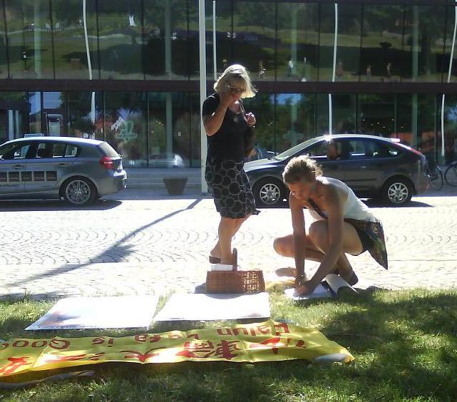 学员们碰到了一对中国厦门移民来哥特兰岛的母女,她们开了一个便利食品亭,学员送给她们法轮功中文真相小册子和退党特刊,向她们讲天安门自焚伪案的真相。最后一天,学员还专门送去一份《九评共产党》。
