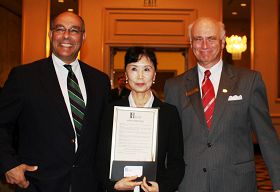 ![]() 伯明翰市市长Larry P. Langford先生(左)颁发褒奖状给神韵晚会主办方。 |
