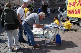 法轮功学员们在汽车之旅中使用了为反迫害十周年所制作的,将递交给丹麦政府的请愿征签表。一路所到之处,有大量的路人自动前来签名,呼吁丹麦政府为制止中共迫害法轮功而做出努力。有时甚至出现人们排队等待签名的场景。