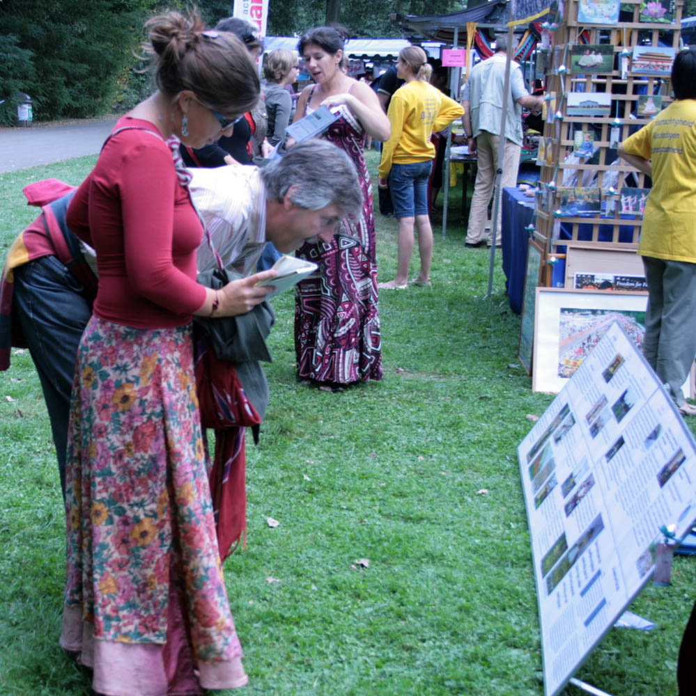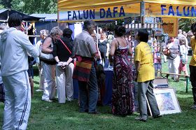 晴朗的天空,绿茵的草地,令节日活动更加生机勃勃。法轮功学员的展地上,黄帐篷、资料桌、法轮功修心健身的图片说明,还有介绍发生在中国的迫害真相的展板。