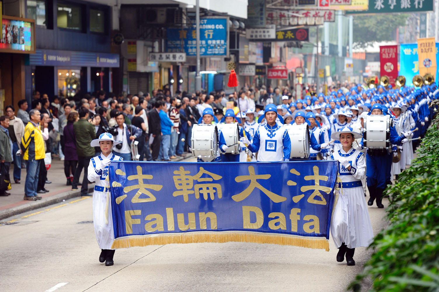![]() 法轮功学员的反迫害游行队伍,在天国乐团领头下向前挺进。 |