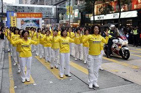 ![]() 法轮功学员在游行中演示功法。 |