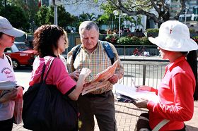 ![]() 游行队伍沿途派发有关介绍神韵在全球广受欢迎及港府破坏神韵演出的特刊,市民及游客纷纷细阅,了解真相。 |