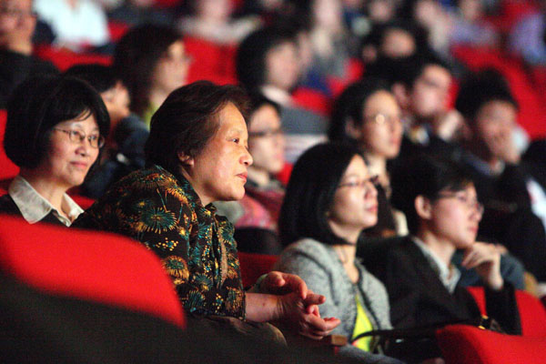 【明慧网二零一零年三月二十三日】(明慧记者郑语焉、李缘台湾台北报导)二零一零年三月二十三日晚,神韵纽约艺术团在台北国父纪念馆进行第六场演出,吸引了各年龄层的观众。有父亲不忘藉着神韵共享天伦之乐,抱着依偎在怀中的小女儿前来观秀,也有年长者虽忘记戴上老花眼镜来观秀,却难掩内心的赞叹向邻座的晚辈轻语道:“没戴眼镜来,但颜色有够美,背景(天幕)图案怎么那么美”。尤其《手绢舞》时,翠绿的手绢在空中旋转后飞回舞蹈演员手上的精彩表演,博得全场观众一连三次喝彩。