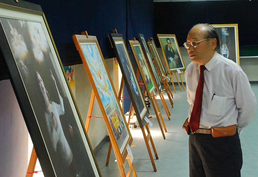 ![]() 梅山乡老人会理事长温文仲仔细欣赏画作 |