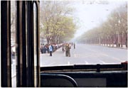 图片摄于一九九九年四月二十五日当天,地点为北京府右街,学员对面的红墙为中南海。图中警察在指挥学员站到指定地点,大部份学员都在安静读书,整个过程秩序良好,城市交通井然。(二零零零年四月二十二日发表)