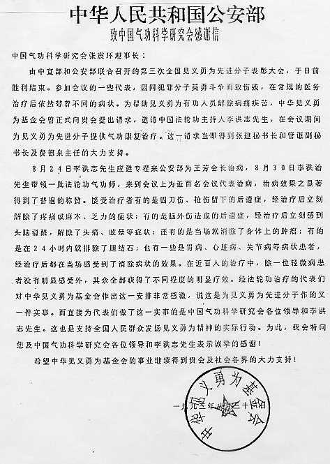 一九九三年八月三十一日,中国公安部所属中华见义勇为基金会致信中国气功科学研究会,感谢李洪志先生为全国第三届见义勇为先进分子表彰大会代表免费提供康复治疗。一九九三年九月二十一日,中国公安部主办的《人民公安报》刊登报导《法轮功为见义勇为先进分子提供康复治疗》,称公安部见义勇为先进分子“经调治后普遍收到了非常好的效果”。一九九三年十二月二十七日,李洪志先生获中国公安部所属中华见义勇为基金会荣誉证书。