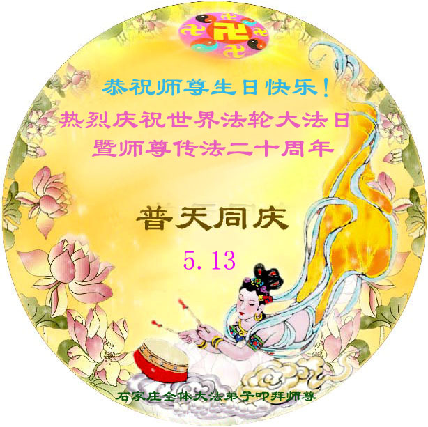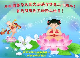 看到越来越多的世人觉醒,法轮功学员真正感受到法轮大法洪传世界的巨大变化。波兰大法弟子在全世界同庆大法弘传二十周年之日,合十感恩师父的慈悲救度,感恩“真、善、忍”为宇宙众生带来的希望,感恩法轮大法佛光普照,礼义圆明。贺卡集锦:同庆5.13 贺师尊华诞