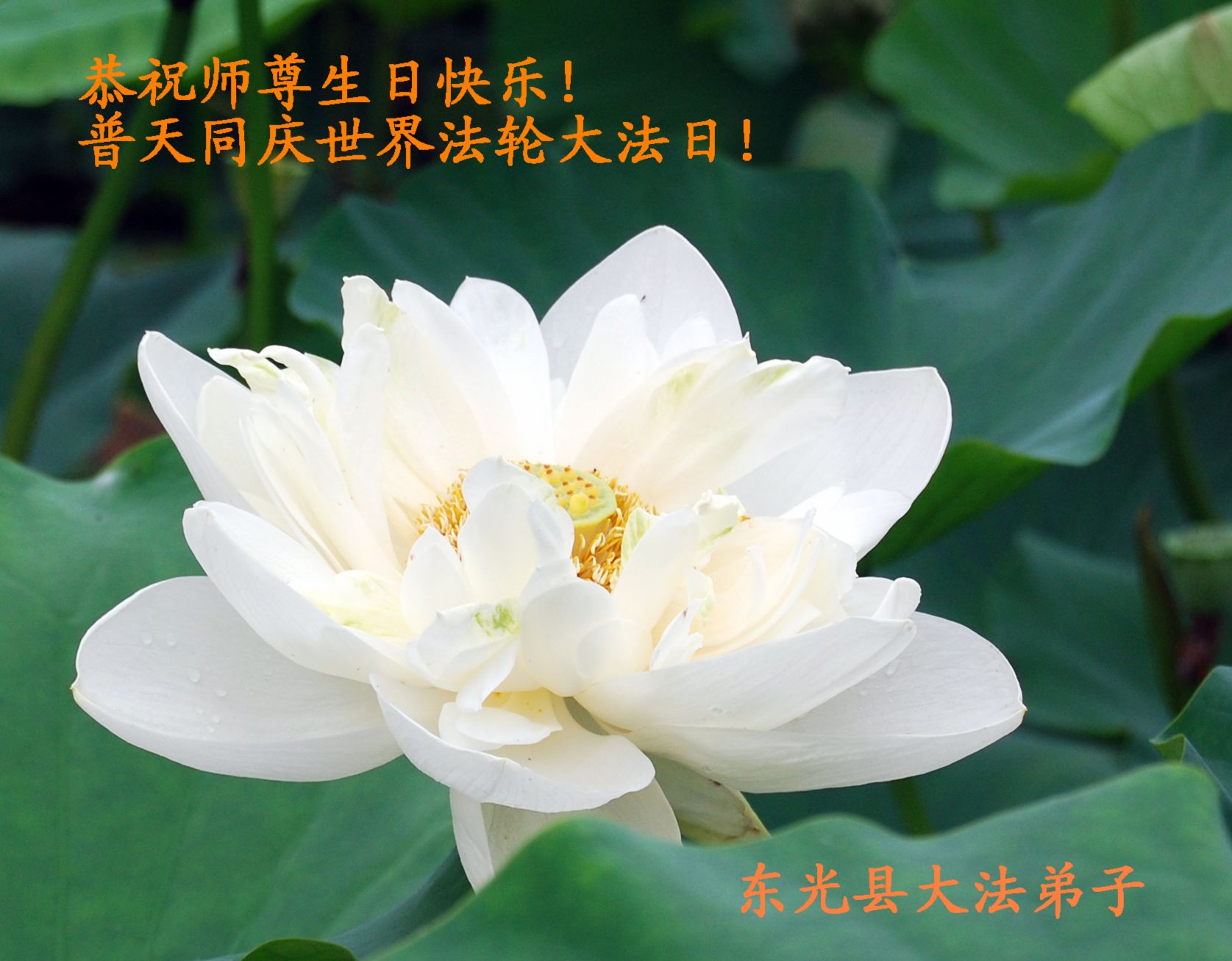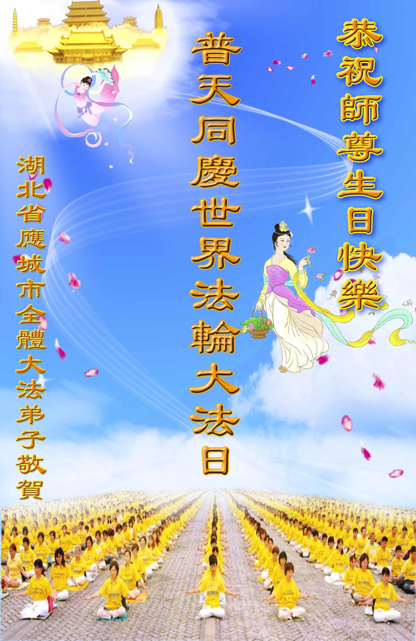 由于前来参加法会的人数众多,法会分为主会场和多个分会场。在主会场的主席台上鲜花芬芳,正中是师尊大法像,两边是写有“法轮常转”和“真善忍”的法轮图形。“正念可救世中人”、“慈悲能溶天地春”的竖幅悬于两边。面对主席台,左侧是横幅“学法不怠变在其中,坚信不动果正莲成”和“精進正悟”;右侧是“大法圆容乾坤正,法王慈悲造大穹”和“法轮常转”,后面是“真善忍”。