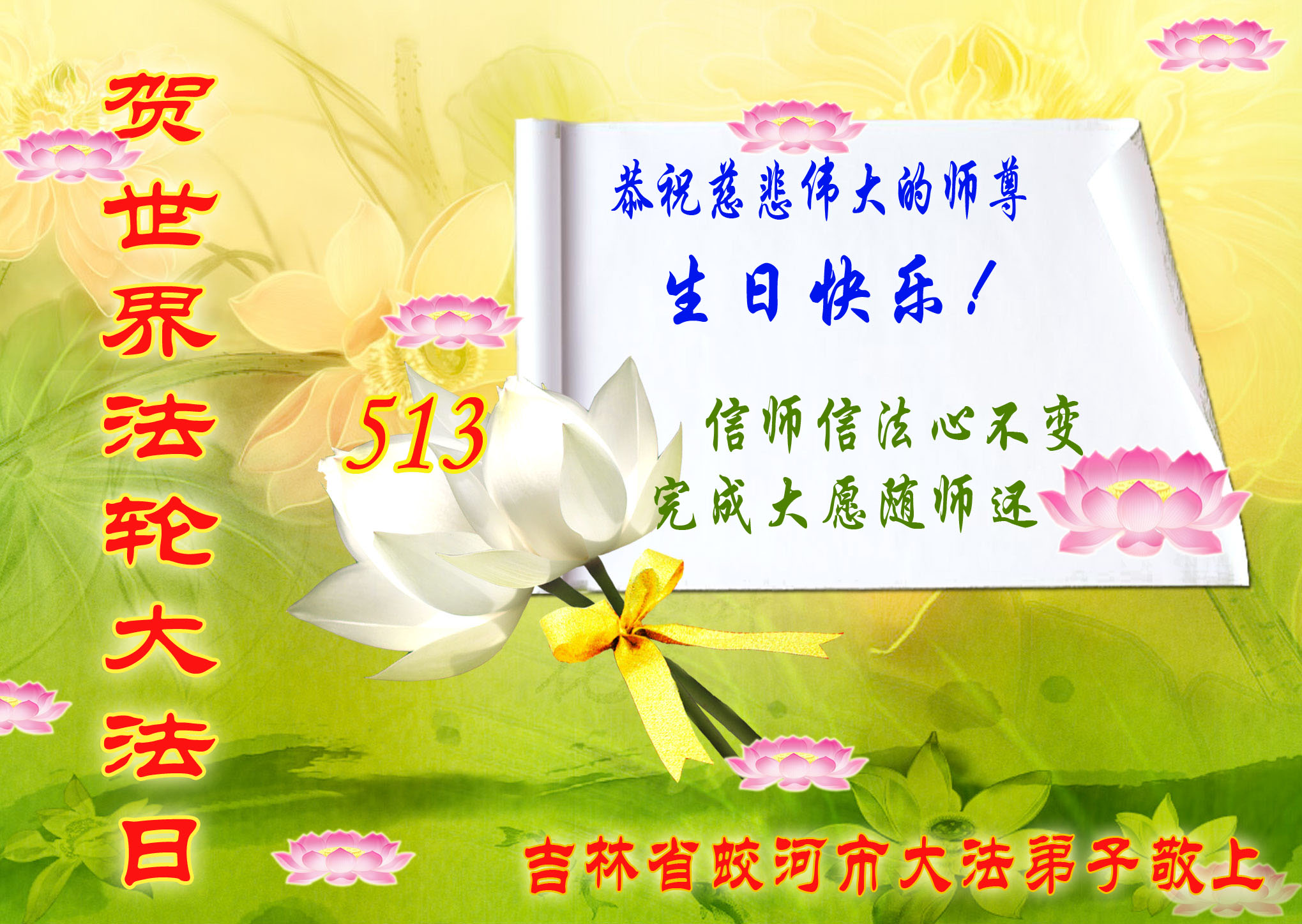 法会开始,主持人代表全体参加法会的大法弟子和全世界大法弟子及芸芸众生恭祝慈悲伟大的师尊生日快乐。