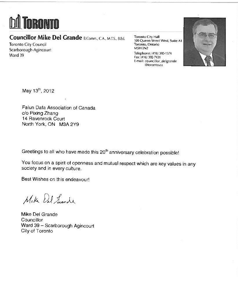 多伦多这个世界上最多元化的城市之一受益与你们的传统和指导理念。这个长达一个月的庆典弘扬着真善忍的价值观,这样的价值观为我们多元城市-以致多元国家的发展进步做出了贡献。再次感谢加拿大法轮大法协会的成员和多伦多居民分享他们的修炼和理念。 ”