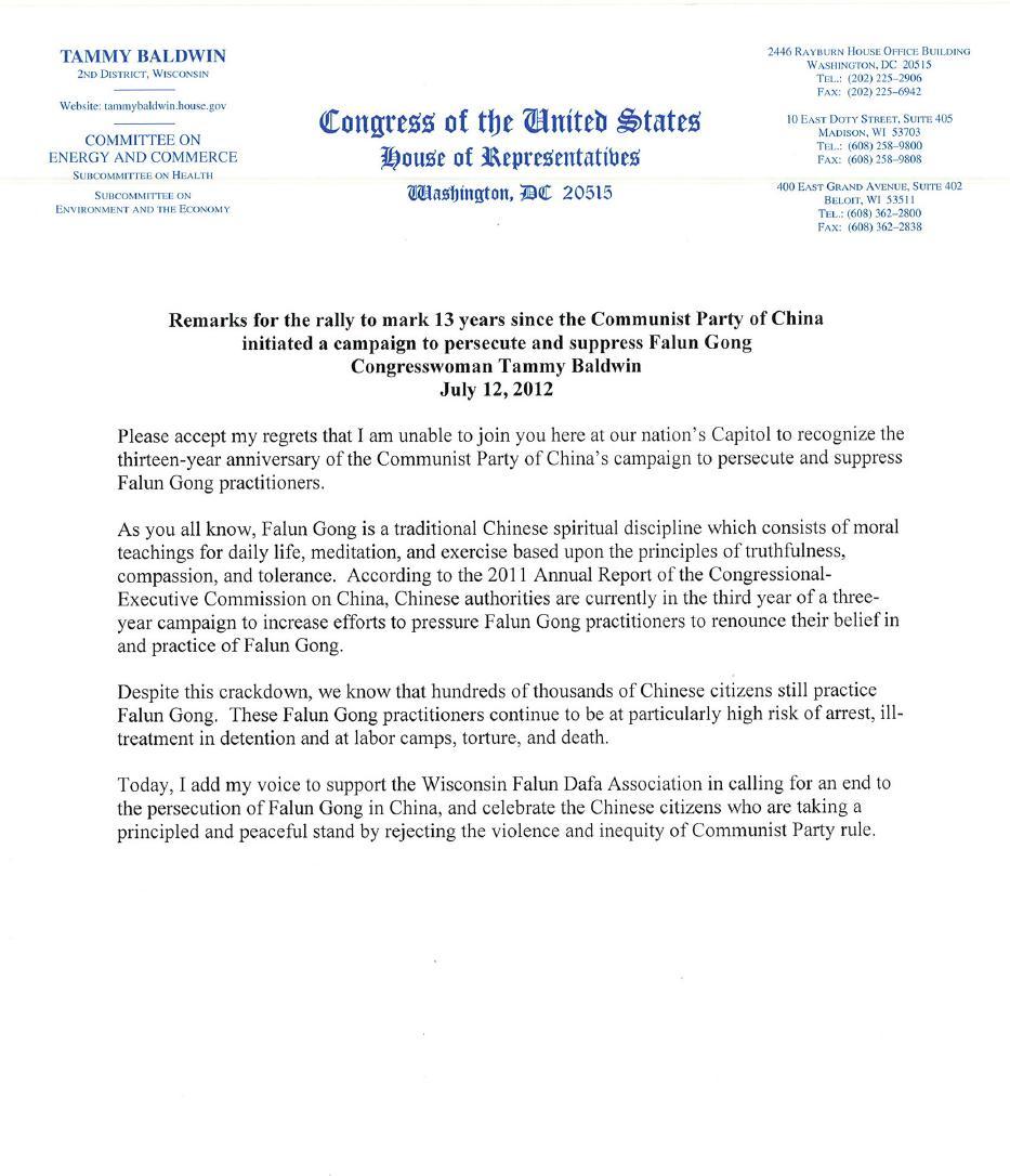 ![]() 美国联邦众议员塔米•鲍德温的支持信 |