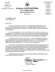 法轮功学员在中国遭受的抓捕、审查和深重的歧视是极大的不公义。请相信我将一如既往支持所有人根据自己意愿说话、写作和信仰的自由,而不必担忧来自政府的迫害和报复。我将继续在国会为保护和推动中国和其它地区的人权而呼吁,我为能够在这正义之战中与这么多热忱的人们同行而感到骄傲。