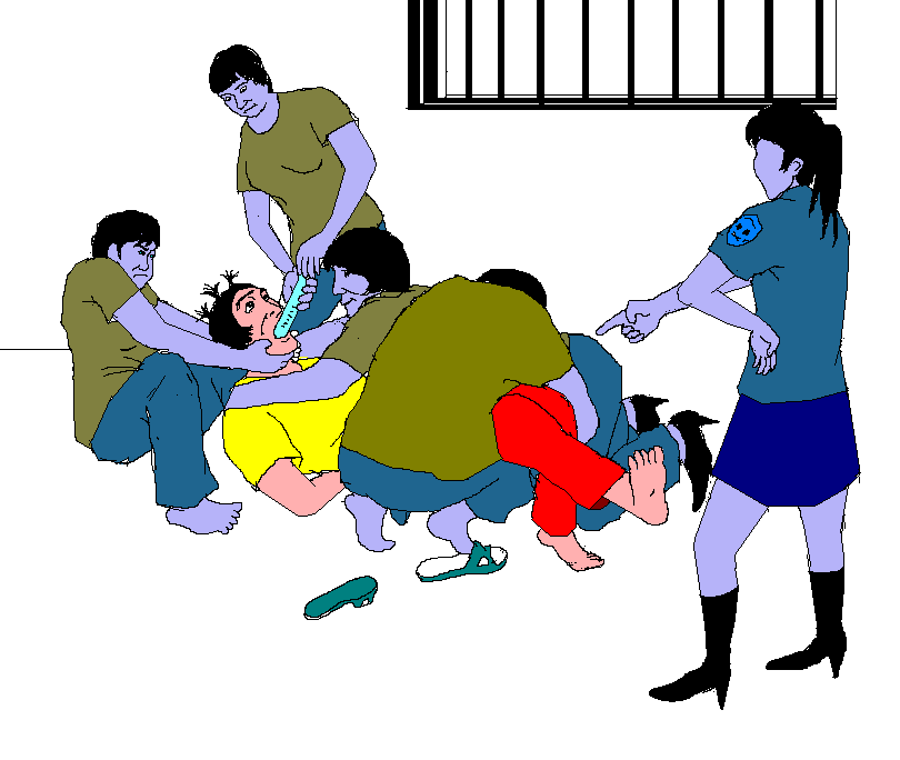 图解:二零零二年元月至五月期间,重庆市原江北茅家山女子劳教所警察就是用这样的方式给法轮大法弟子邱翠香用注射器强行灌药。旁边指使的是劳教所女恶警杨明,强行灌药的都是吸毒劳教人员,他们侮辱性地把邱翠香的头发扎成奇形怪状,灌药时有的抱头、撬嘴,有的抱脚,有的按肩膀,另一个就是拿注射器,用自来水兑药,强行塞进口中进行灌药。重庆法轮功学员周成渝、龙岗、王积琴等,就是被劳教所的恶警们用这种邪恶的“灌药”方式摧残致死的。