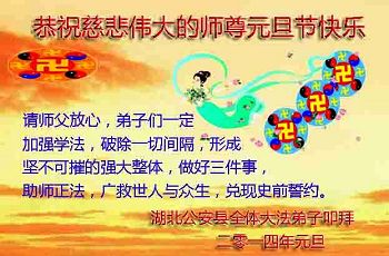 我们家族祖孙四代三十余口一直相信法轮大法,敬重李洪志大师。因为我们的亲戚中有数名大法弟子,从他(她)们身上让我们看到了法轮大法的美好、纯正与神奇,我们家族也跟着受益多多,每个家庭都平安幸福,吉祥如意,喜事接连不断,这是我们相信大法、敬重李大师得到的福报。因此,特借二零一四年元旦来临之际,我们全家向李大师表示最诚挚的感谢!恭祝李大师元旦快乐!