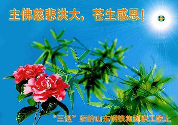 新年伊始,首先叩谢李大师慈悲救度洪恩!我们庆幸自己还能够有如此殊荣向慈悲伟大的李大师献上最诚挚的感恩,曾几何时,由于自己一时糊涂听信了中共邪党的谎言,一度的仇恨着坚持正信的法轮功修炼者,可是事实是不可抗拒的,我们看到身边的每一位法轮功修炼者原来并不象中共邪党宣传的那样,我们亲眼目睹了他们的处事原则,遇事首先为别人着想,兢兢业业的工作,不争不斗的高贵品格,总是把微笑无私的带给对方,在邪党无理迫害下那种大义凛然的壮举令世人敬佩,这哪象中共邪党宣传的那样?这样的好人太难找了!在此奉劝那些与中共邪党还没有划清界限的世人,擦亮自己的眼睛用清醒的头脑来了解法轮功,如此高德大法,如此善良的民众才是人类的希望。