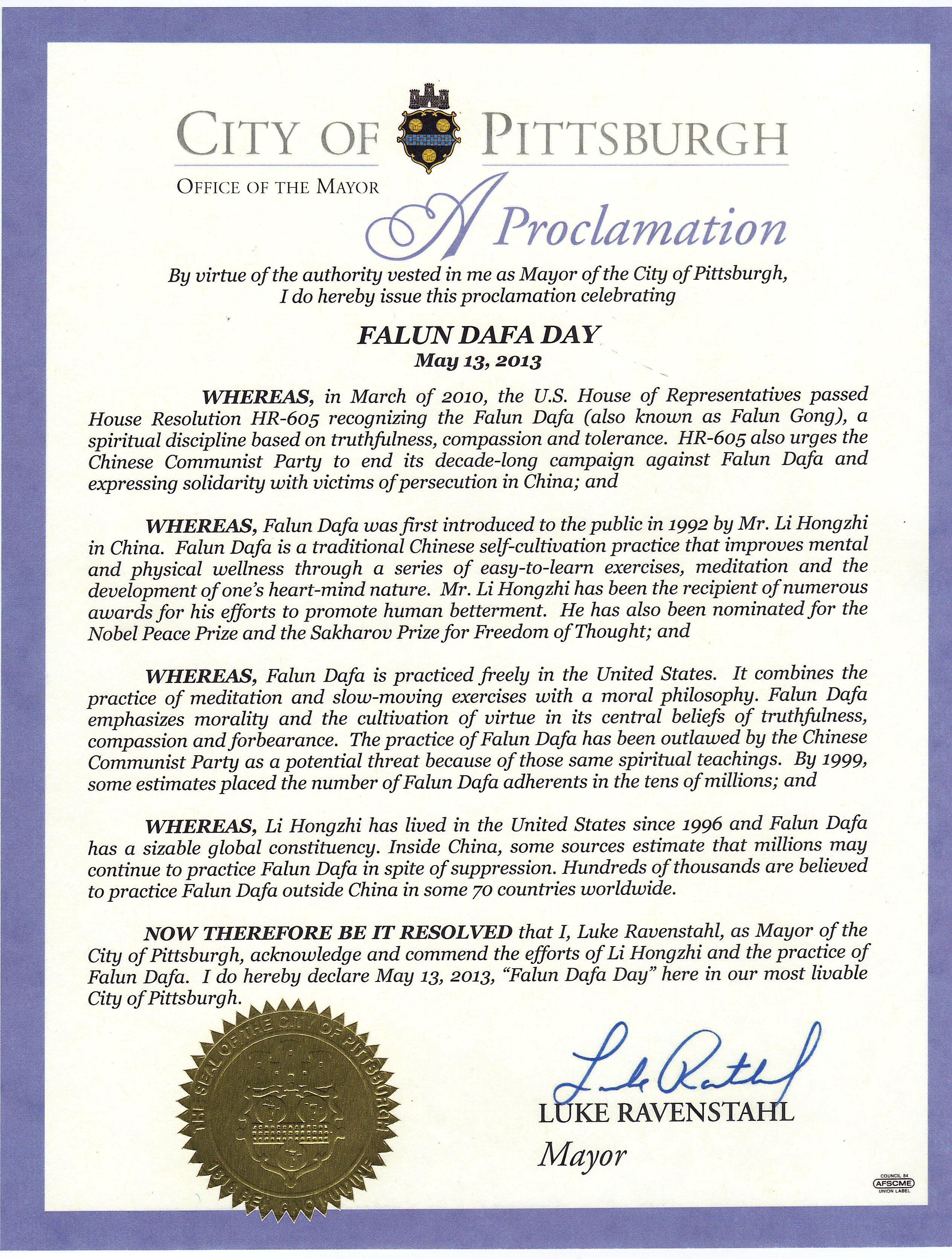 因此,我,卢克•瑞文斯朵(Luke Ravenstahl),以匹兹堡市市长的名义感谢和表彰李洪志先生及法轮大法修炼。我宣布二零一三年五月十三日为我们最宜居的匹兹堡市的“法轮大法日”。