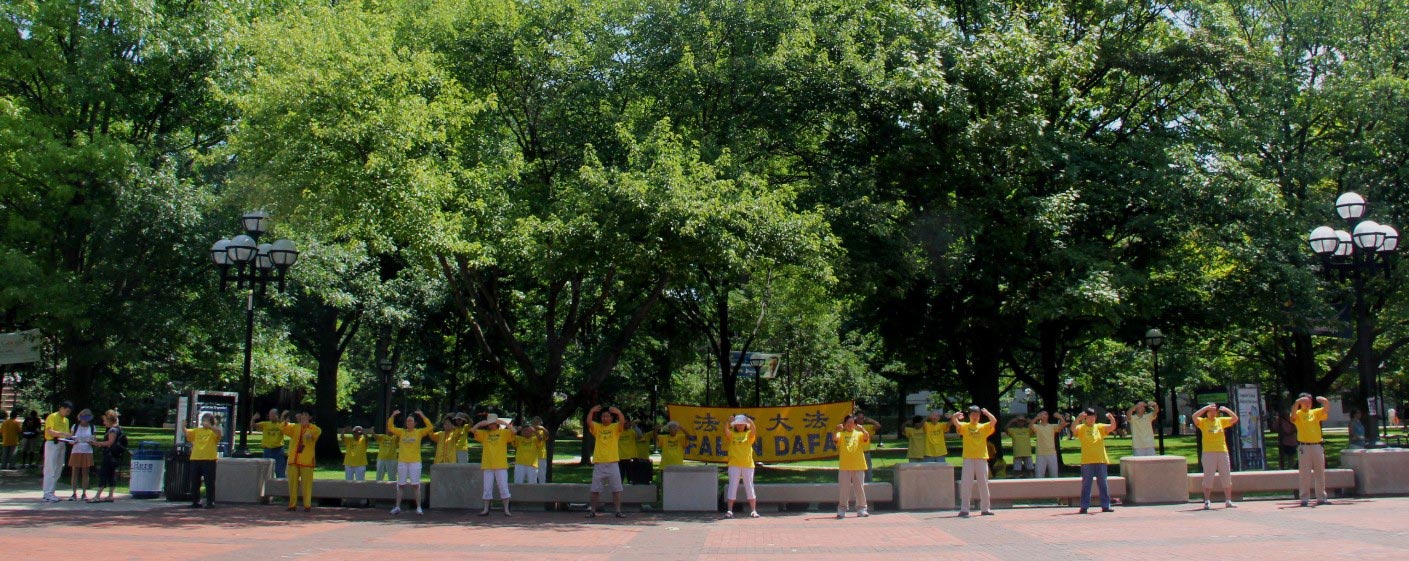 ![]() 部分密西根州的法轮功学员们在安娜堡校区中心广场上集体炼功 |