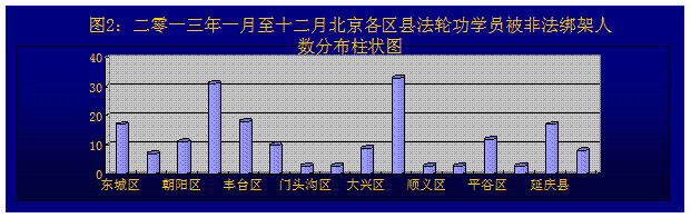 ![]() 图2:二零一三年一月至十二月北京各区县法轮功学员被绑架人数分布柱状图 |