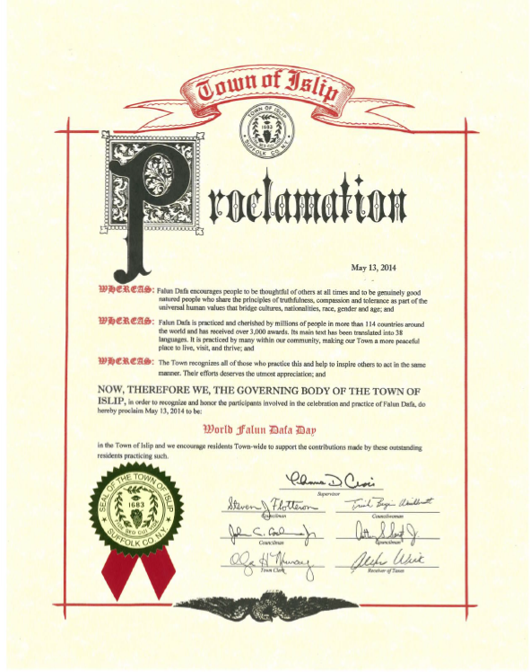 因此,艾斯利普镇的行政机关嘉奖庆祝法轮大法日的修炼者们,宣布