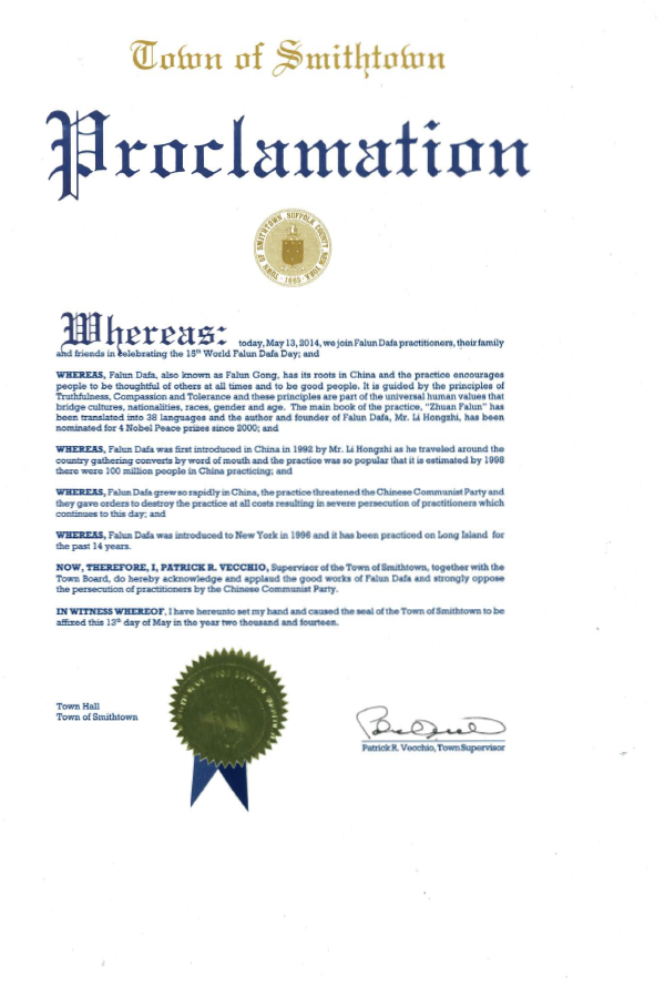 鉴于,法轮大法于一九九六年传入纽约并在长岛有十四年的传播。
