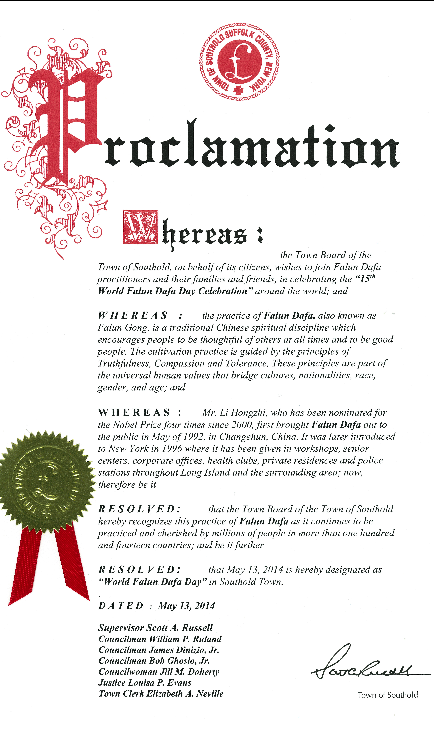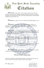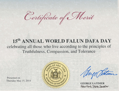 【明慧网二零一四年五月二十二日】(明慧记者采菊纽约报道)二零一四年五月十三日是第十五届世界法轮大法日,也是法轮大法传世二十二周年,美国纽约州联邦议员们和纽约州参众两院及纽约市和区镇等三十五位政要颁发褒奖和贺信,祝贺法轮大法日,称颂大法弘传世界的盛况。