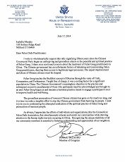 二零一四年“七•二零”前夕,多位美国国会参、众议员致函法轮功学员,他们在信中说:“十五年的迫害时间太长,现在是结束对法轮功修炼者的人权迫害的时候了”,并表示与法轮功学员一道,要求中共停止迫害法轮功。