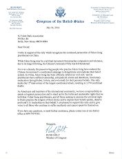 感谢您邀请我参加关于法轮功团体受到人权侵害的集会。非常抱歉我今天无法到场。在当今的中国对法轮功学员和基督徒的囚禁和虐待是违背天理的。这实在是对人权的最严重的侵犯。必须停止对人类尊严如此的践踏,必须停止对各种不同信仰群体的迫害。我很赞赏您付出的辛劳和毅力。我在国会将为保护人权而继续奋斗。
