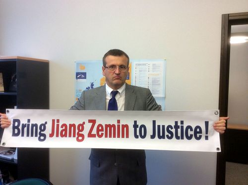 ![]() 欧洲议会议员斯蒂芬•埃克先生(Stefan Eck)手举“法办江泽民!”的横幅 |