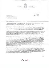 听到您的亲属姜月梅和张玉良被拘禁的消息我很难过。这种案件应该被强烈关注,我很感谢你通知我这个消息。加拿大政府通过双边和多边的各种合适渠道向中国政府表达关注。总理史蒂芬·哈珀和我在访问中国的双边会议上直接向中国方面的与会者提出了关于人权和宗教自由问题,其中包括对法轮功修炼者的尊重。另外,在2013年2月宗教自由办公室成立的公开声明里,总理也为受到威胁和迫害的法轮功学员及其它宗教团体发声。