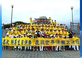 台东地区法轮功学员,在台东市海滨公园集体炼功,庆祝李洪志先生华诞和法轮大法弘传二十三周年。台东市长和各界代表也来参加庆祝活动。