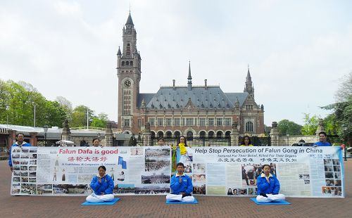 五月十七日,荷兰学员来到荷兰行政首都海牙国际法庭门前,向游客展示法轮大法弘传世界图片展板。