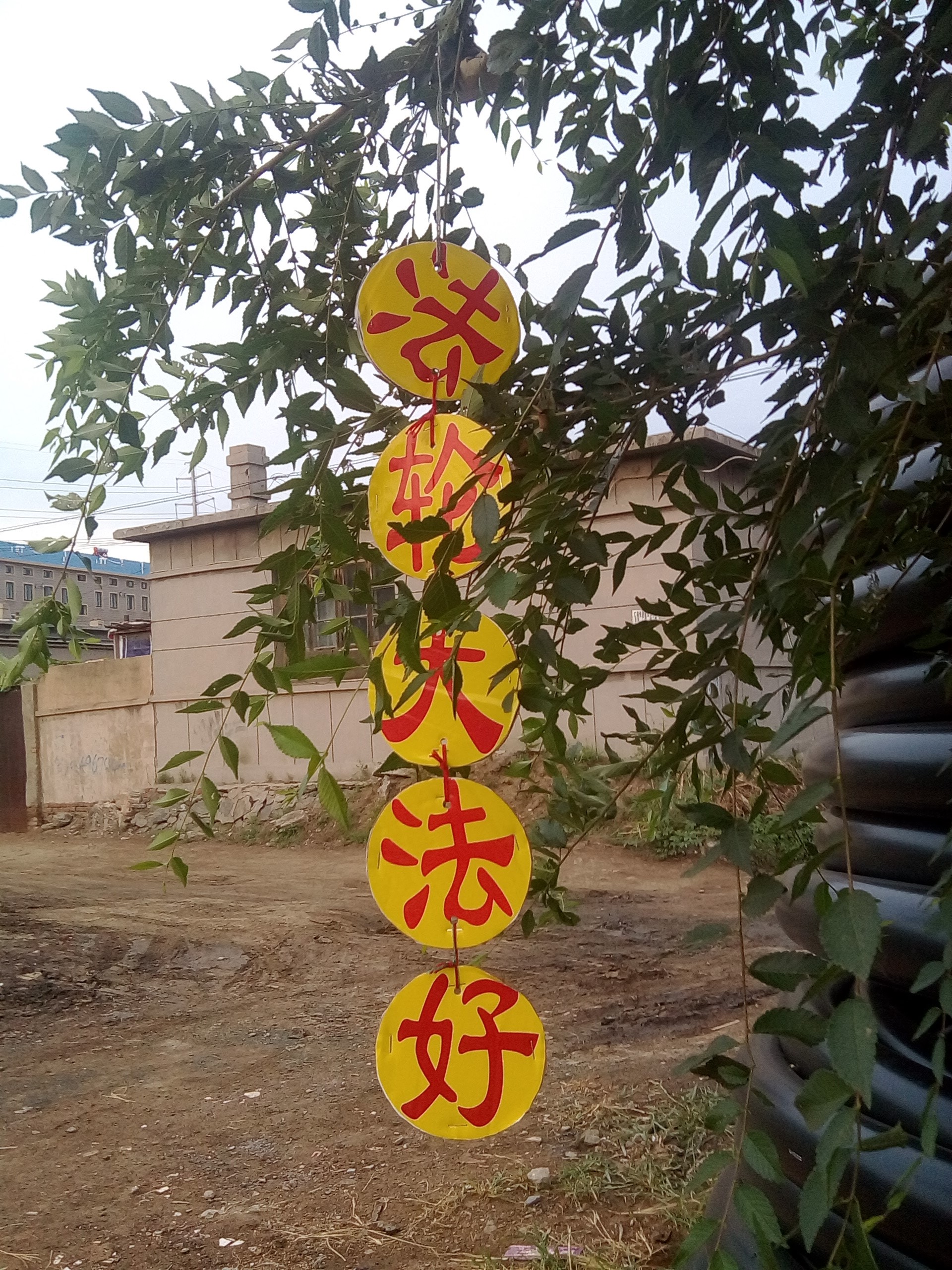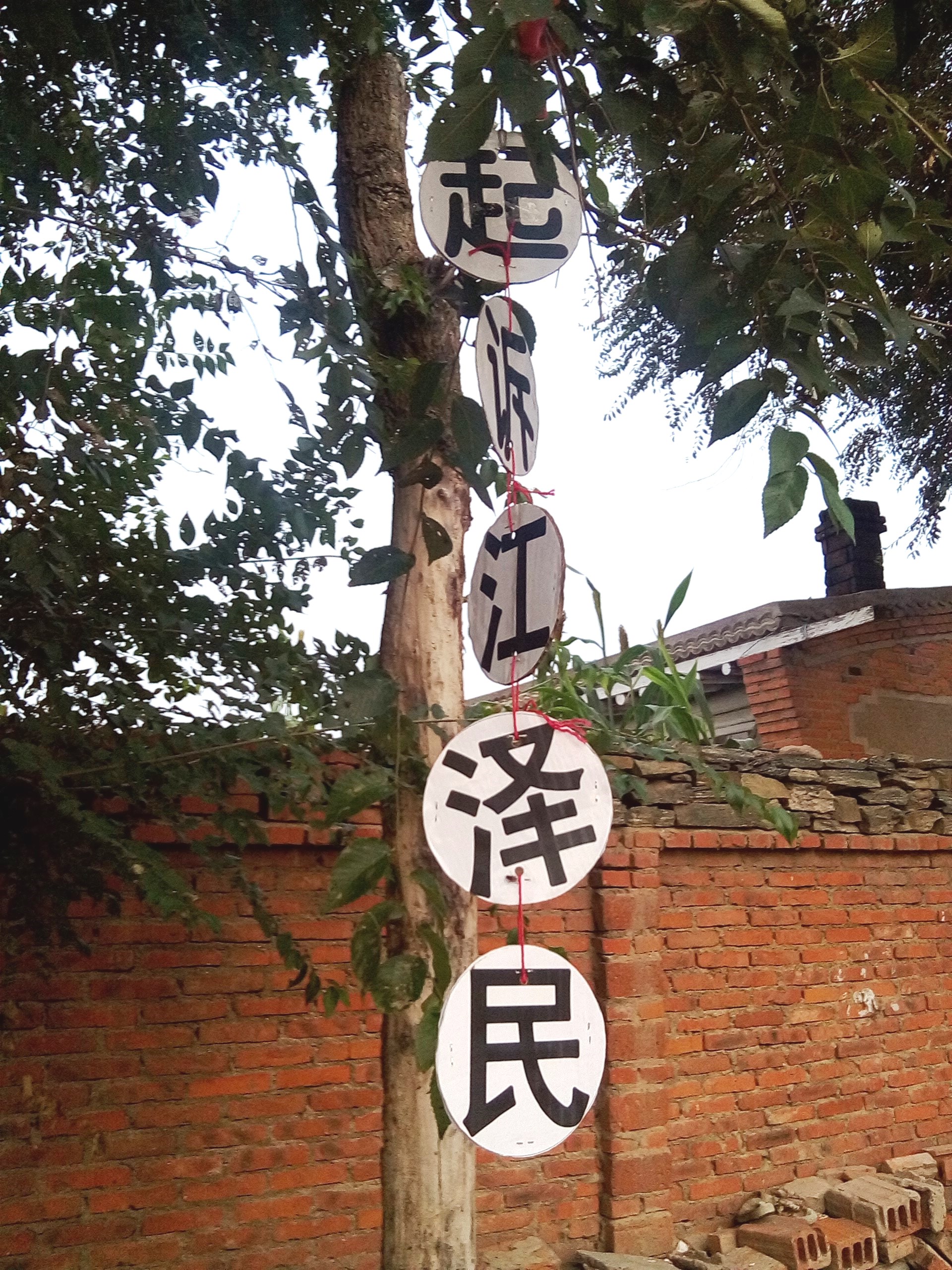“诉江挂”用废光盘或纸壳剪成,和光盘一般大小,两面贴上印好的字,上下打孔,四边用四个订书钉加固,在孔里穿线连接,上边用长线把用布包好的石子绑紧绑好,用时往树上一甩,随身携带,方便快捷。