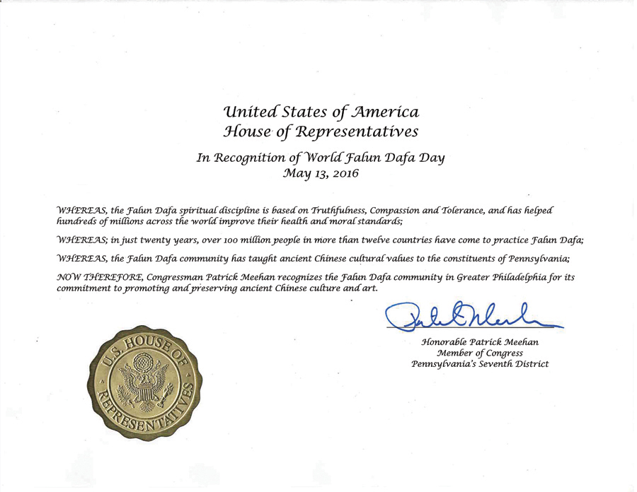 国会众议员帕特里克﹒米汉特此感谢大费城地区的法轮大法群体为弘扬与维护传统中国文化所作出的努力。