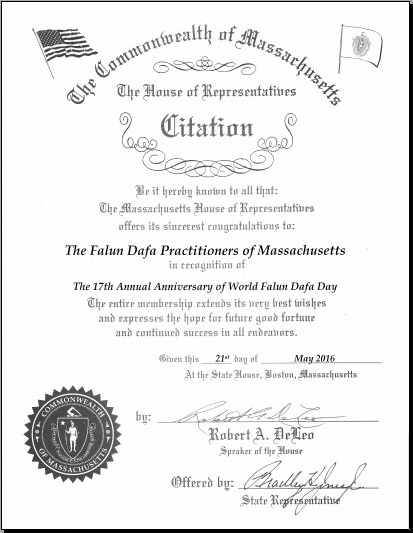 褒奖状中说,值此第十七届世界法轮大法日之际,麻萨诸塞州众议院向麻萨诸塞州的法轮大法学员们致以最诚挚的祝贺。众议院全体议员向你们致以良好的祝愿,并祝福你们未来继续好运、成功。