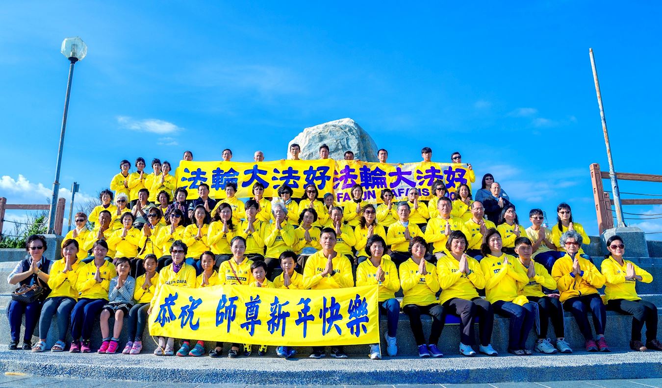 【明慧网二零一七年一月二十四日】二零一七年中国新年来临之际,台湾台东部份法轮功学员齐聚在台东市海滨公园,双手合十向慈悲伟大的法轮功创始人李洪志师父拜年,“恭祝师尊新年快乐!”的声音在太平洋滨直上云霄。法轮功学员展示祥和优美的五套功法,午后阳光普照,金黄色上衣映着蓝天碧海,美丽画面吸引许多游客与民众观看。