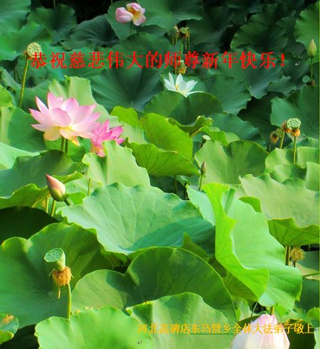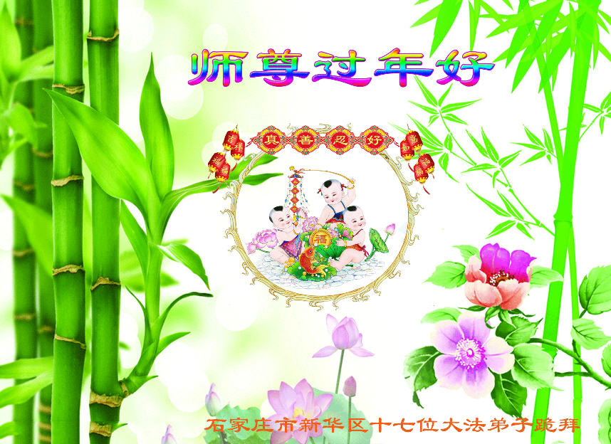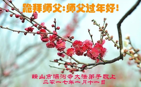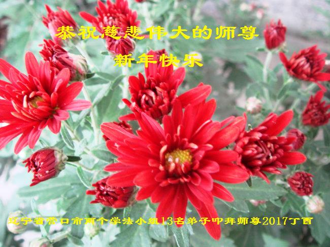 值此丁酉年新年之际,来自四川遂宁、辽宁抚顺、吉林长春、山东省威海、河北石家庄、吉林德惠、四川成都、山东招远、辽宁鞍山、湖北武汉、吉林舒兰、辽宁义县、重庆开州、湖北天门、胜利油田等七省十五地的资料点的大法弟子给慈悲伟大的李洪志师尊拜年!