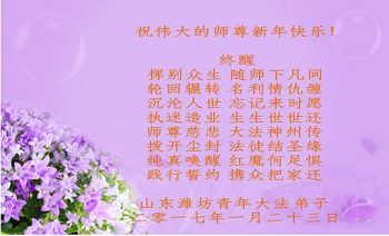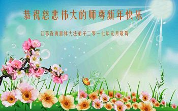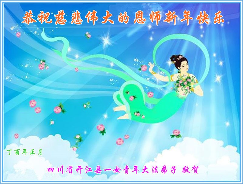 “要感谢师父的太多太多了,师父把大法传给我们,把我以前不正的行为归正,身心受益无法用言语答谢,内心说:师父谢谢您,师父新年好。”