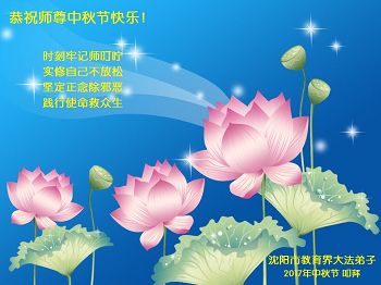 在二零一七年传统中秋喜庆佳节来临之际,弟子深怀无限感恩的心情叩拜师父,感恩师父的慈悲苦度,感恩师父对众苍生的慈悲救度,恭祝师父中秋好。在师父正法最后时间里,弟子一定用心学好法,向内修,修好自己,用心做好三件事,用心救人,兑现誓约,绝不辜负师父的慈悲苦度,跟师父回家。