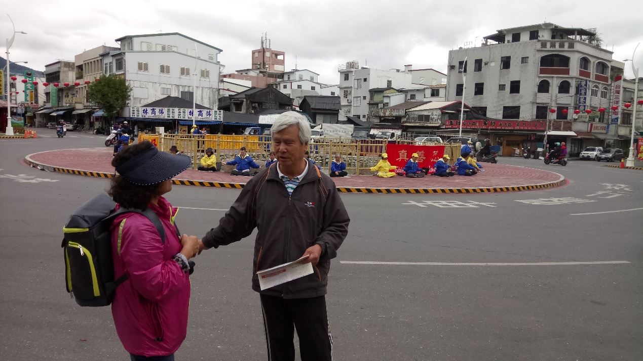 花莲东部地区部份法轮功学员每月都会安排举办讲真相活动,活动过程中,法轮功学员们通过集体炼功,真相展板,图文解说等方式,有的走进每个街道去讲真相,让越来越多的民众了解在中国大陆,江泽民利用中共国家机器迫害甚至活摘法轮功学员器官的反人类罪行,不少东部民众在了解真相后签名声援法轮功学员制止迫害。
