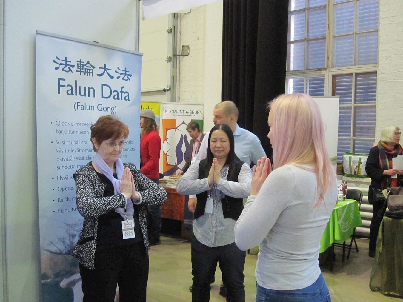 【明慧网二零一七年三月三日】二零一七年二月二十五日、二十六日,在芬兰首都赫尔辛基市举办的第五届瑜伽(Joogafestival)健康博览会上,芬兰部份法轮功学员向人们传播法轮功的美好,并呼吁制止中共活摘器官。参加博览会的人们有公司经理、牧师、音乐家、艺术家和学生等,人们都感兴趣地了解法轮功真相。