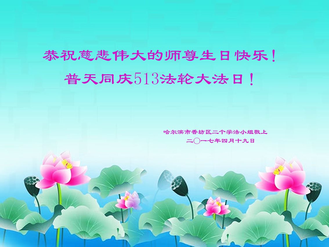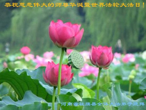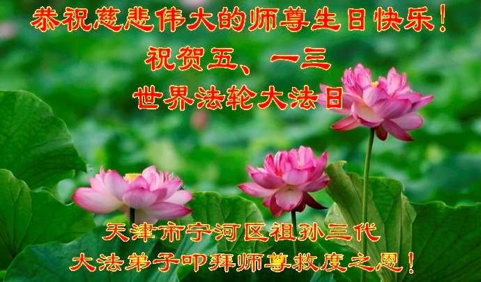 在“5.13”这个感恩的日子,我们天津市宁河区全体大法弟子祝师尊生日快乐!师尊您辛苦了! 我们深知师尊救度一个生命的艰辛,切身体会到一个生命被救度的荣幸!能成为师父的弟子,能成为宇宙大法修炼者中的一员,是多么的幸福!在师父慈悲救度下,在师父的保护与加持下,我们由一个业力满身的人走在了成神的路上,弟子们对师父无限的敬仰,无限的感恩!