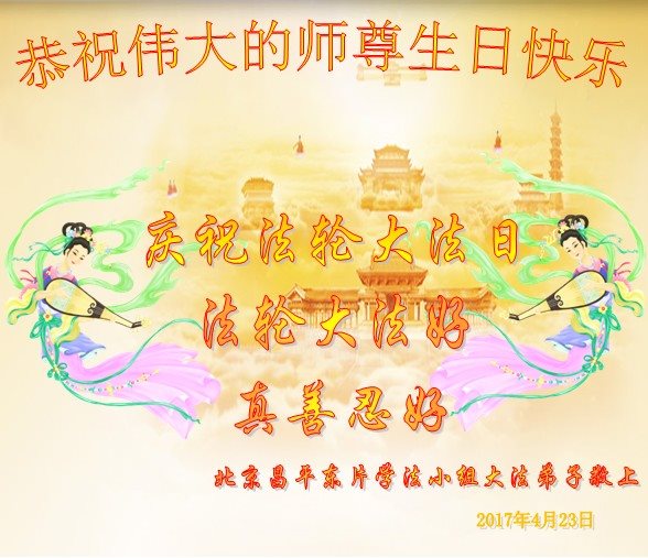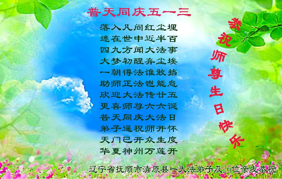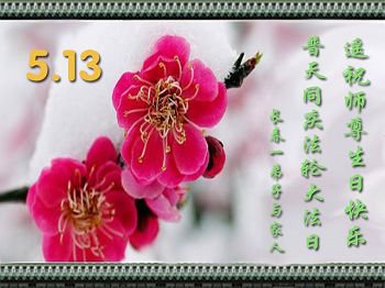 “五·一三”世界法轮大法日是普天同庆的伟大节日,今年的“五·一三”是法轮大法传世二十五周年,又是伟大师尊六十六岁华诞,在此,北京清华大学大法弟子向至尊至敬的师父致以最崇高的敬意!恭祝慈悲伟大师尊生日快乐!师父好!师父您辛苦了!师父谢谢您!
