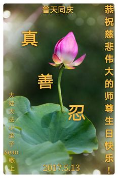 在五月十三日来临之际,我在这里祝贺法轮大法洪传二十五周年,同时祝李老师生日快乐!这二十五年来,万兴能有法轮大法的出现,是真善忍改变了这个世界,让人们真正认识到了什么才是宇宙的真理。然而在中共统治下的中国,却违背人伦,对信仰真善忍的好人无理打压,肆意抓捕、迫害,让这些好人蒙冤,我真心希望天灭中共之日早些到来,早日将这些迫害法轮大法好人的罪犯绳之以法,让他们得到应有的惩罚。