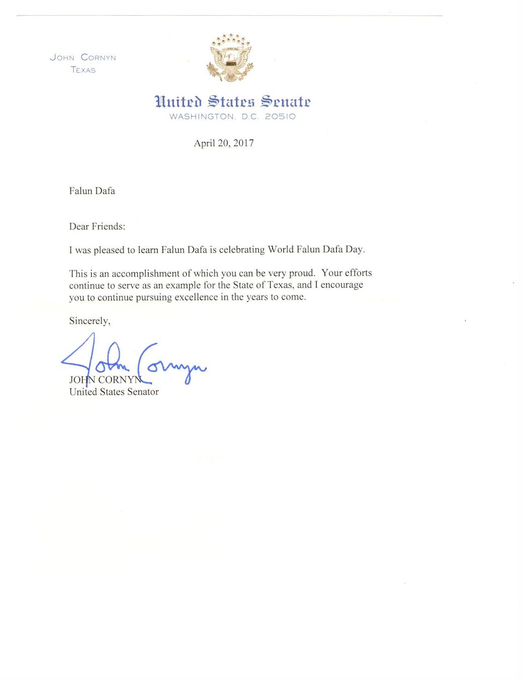 美国资深参议员John Cornyn长期关注中国的人权问题,今年年初,有位德州达拉斯地区居民的亲人因修炼法轮功在中国大陆上海遭非法关押。Cornyn参议员对此事很关注,就此事向美国国务院提交请求查询相关信息。他在第十八届世界法轮大法日到来之前,参议员Cornyn发来贺信,称赞法轮大法的所有努力和取得的成就,认为是在给德州树立的榜样,希望保持下去。